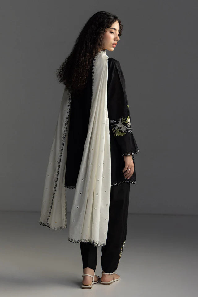 A black shirt with Japanese floral embroidery, paired with a dyed black trouser, and finished with a chikankari embroidered pearl white dupatta for a refined, statement making ensemble.