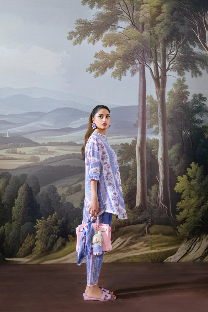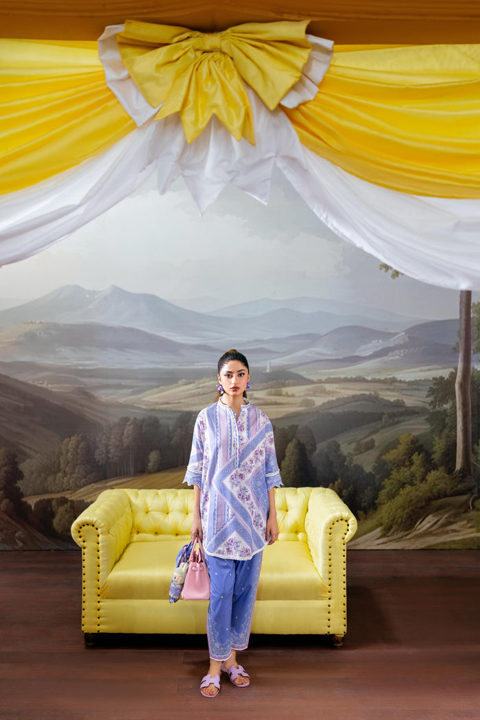 A two-piece printed set in rich purple, patterned with a mix of geometric designs and soft florals. The neckline is adorned with a fine lace trim, while delicate cutwork adds texture to the sleeves. Paired with a printed shalwar for a statement yet wearable summer look.
