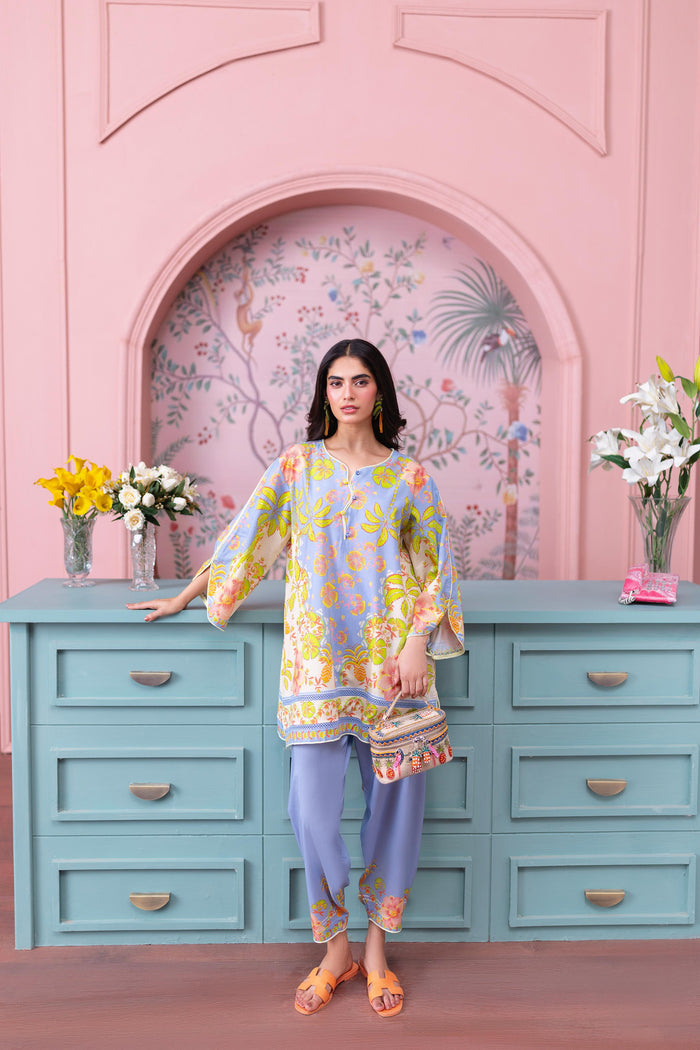 A two-piece printed set in soft periwinkle, accented with shades of green and coral. The wavy neckline is finished with dainty buttons for a touch of charm, while straight sleeves keep the look clean and polished. Paired with a printed shalwar for understated everyday elegance.