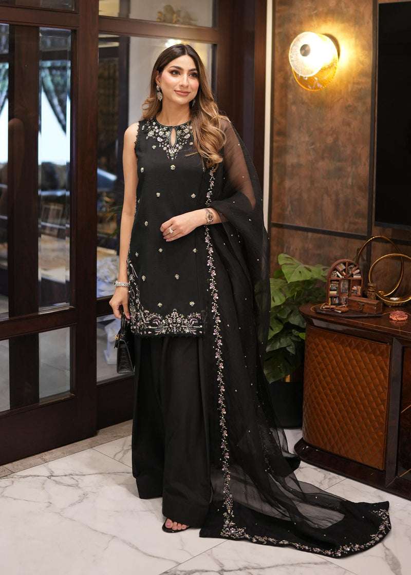 Miraal is a striking black ensemble that embodies elegance and bold sophistication. Crafted from luxurious raw silk, the kurta features intricate hand embroidery and delicate embellishments that highlight its refined craftsmanship. The flowing Farshi shalwar adds a regal, dramatic flair, while the sheer organza dupatta introduces an ethereal softness to the overall look. Rich in texture and detail, Miraal is designed for those who seek timeless beauty with a contemporary edge, making it a perfect choice for elevated festive occasions.