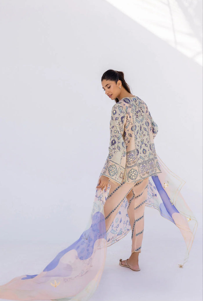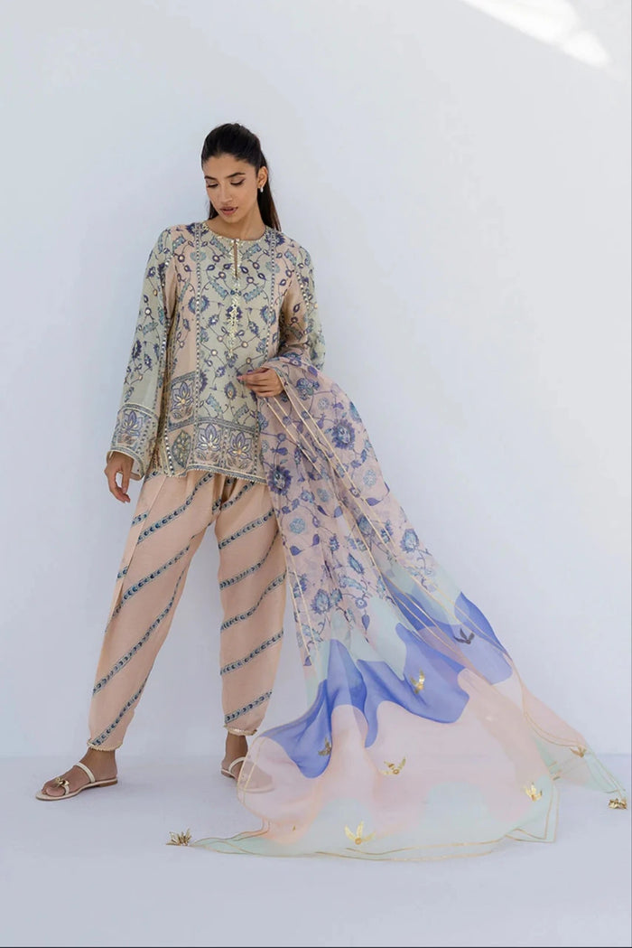 Cool, calm and quietly luxe, this relaxed kurta features intricate sequin and gota embroidery over a printed cotton net canvas in the lightest hues of blush and powder blue. It is paired with a matching pure rawsilk shalwar embellished with delicate sequined vines, and a diaphanous organza dupatta that flows in a dreamy blend of powder blue, azure and blush.