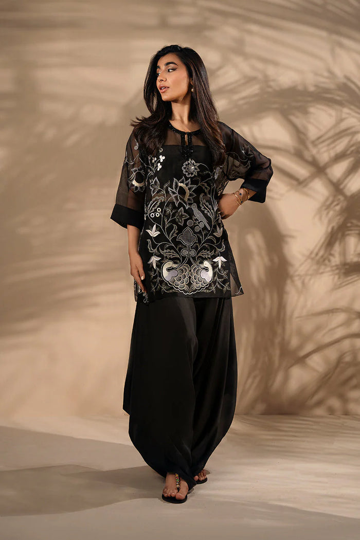 A sheer ebony toned organza top is brought to life with ivory and moonstone floral embroidery, set against a contemporary silhouette. The beaded neckline adds a hint of shimmer, layered over a precisely tailored charmeuse tube top. Paired with a fluid charmeuse draped pants, the look unfolds with understated drama and modern edge.