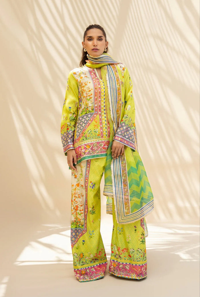 A sleeveless khaddi silk top in lime tone and candy pinktones features intricate floral painterly prints, accented with delicate gota and sequin embroidery. The cascading organza dupatta in a lime hue is enriched with subtle blush and gold florals and finished with gota detailing along the borders. It is paired with wide-legged khaddi silk trousers adorned with a complementing print and scattered gota, offering a contemporary expression of traditional elegance.