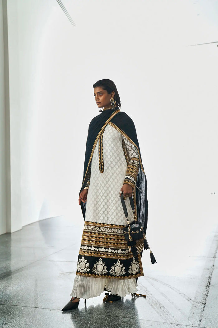 Shirt: White shirt is made with bootie organza fabric with criss cross pattern on both sides using techniques of thread, marori and sequins work on sleeves, front and back borders.