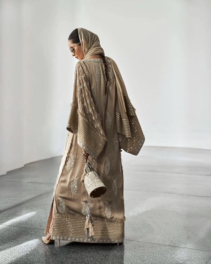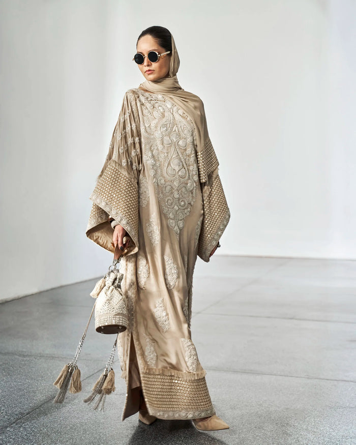 Kaftan: Beige pure silk heavily embroidered with thread, zari and sequins work all over with detailings of fringes on sleeves, sides and daman.
