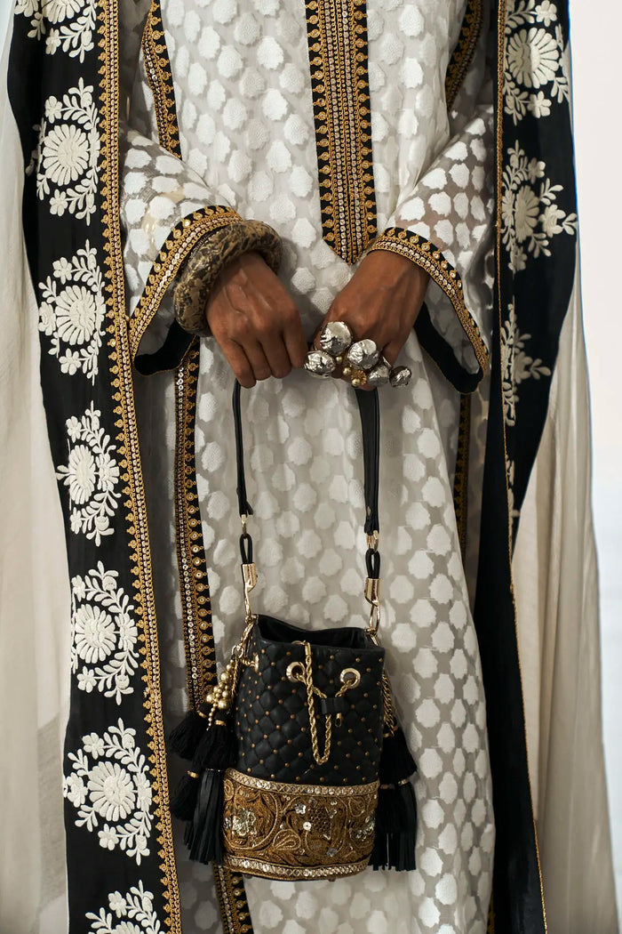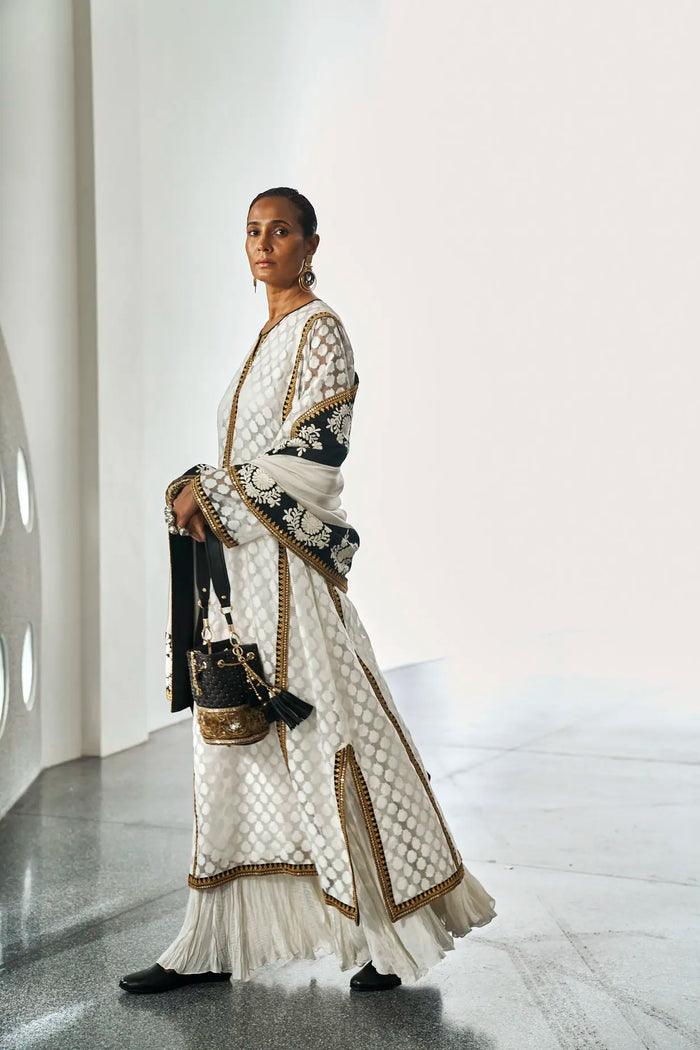 Dupatta: Dupatta is made with white pure silk net using technique of thread, marori and sequins work on black pure raw silk all over borders.