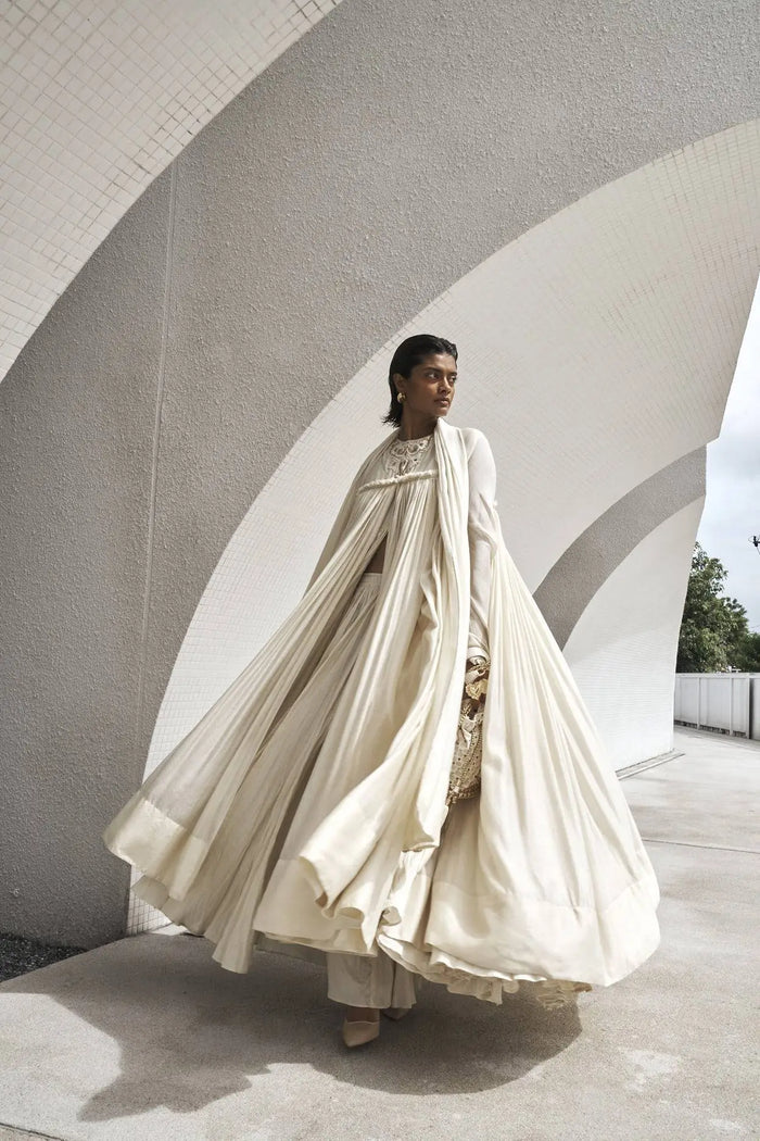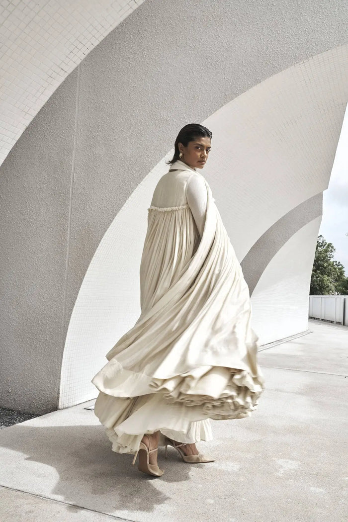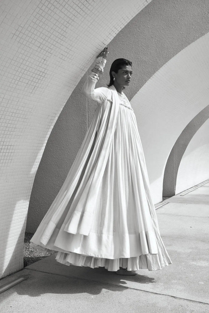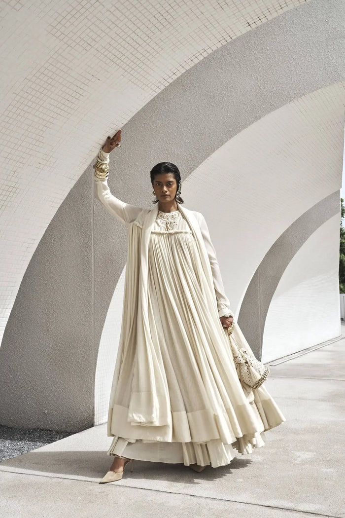 Gown: Pure silk net front open ankle length flared gown with bodice and chooridar sleeves finished with raw silk borders