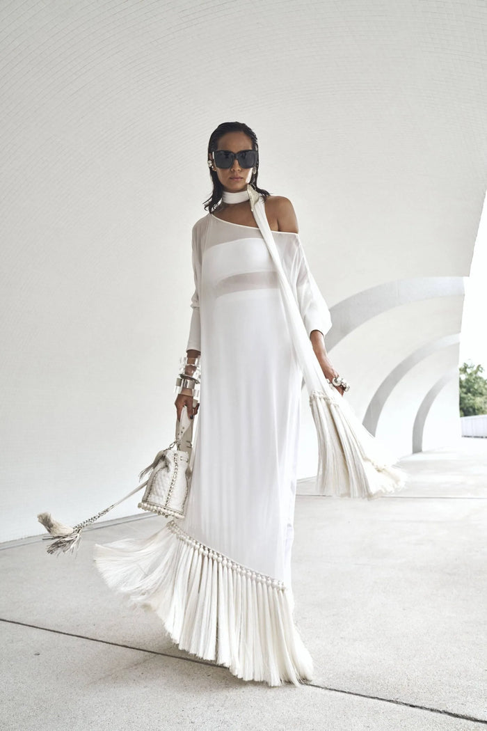 Shirt: Milky white off shoulder floor length shirt in 60 gram pure chiffon georgette with tassels, baggy sleeves with loop buttons detailing. Inner tube made with lycra stretch (can be converted into camisole or long lining- charges may apply for long lining).