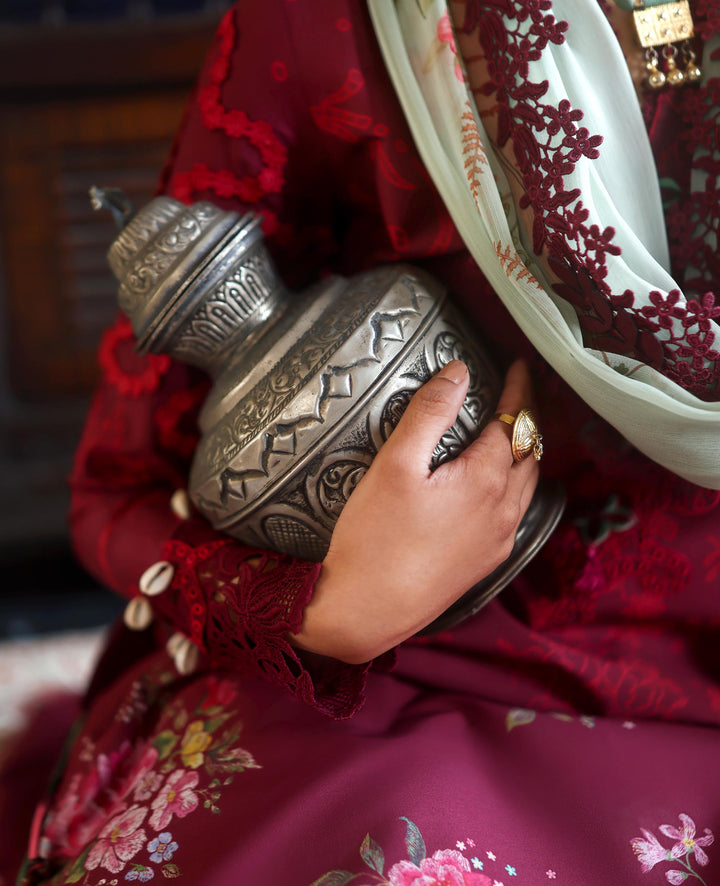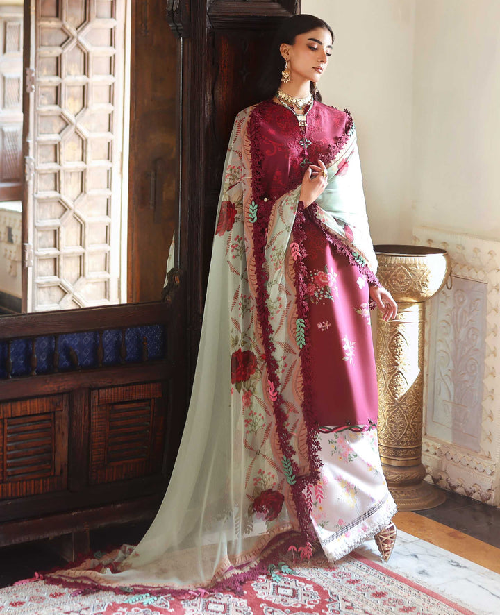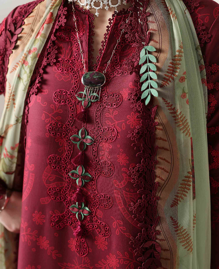 Deep red printed lawn unstitched outfit paired with a floral chiffon dupatta and white contrast shalwar. Subtle embroidery on the neckline and sleeves perfect for everyday comfort with a touch of grace.