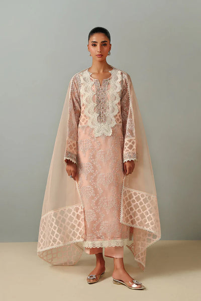 A refined peach ensemble features a long, straight-cut shirt made from embroidered fabric with tonal floral patterns and lots of lace accents all over. The neckline is constructed with lace panels and hand-embellished with pearls, sequins, and beadwork. The sheer sleeves include embroidered motifs, embellished cuffs, and lace edging. The set is completed with matching straight pants and a lightweight sheer dupatta featuring coordinating borders with lace edging. A perfect choice for formal and festive events.