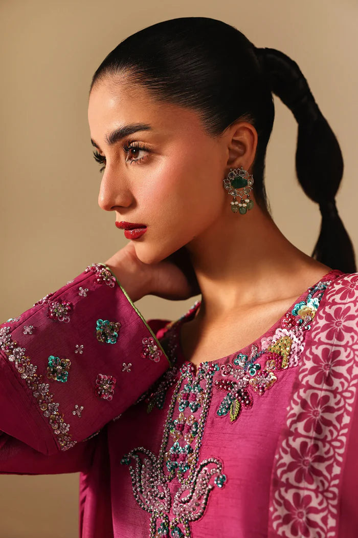Featuring a striking berry-pink straight-cut shirt in an elongated silhouette. The front and sleeves are richly hand-embellished with intricate floral motifs using sequins, beads, and fine thread-work. It is paired with tailored straight-cut pants that include delicate bead work along the hem. The look is completed with a light printed dupatta, offering a balance of sophisticated hand-work and modern fluidity. A signature AMMARA KHAN creation, an expression of detail, and refined luxury.