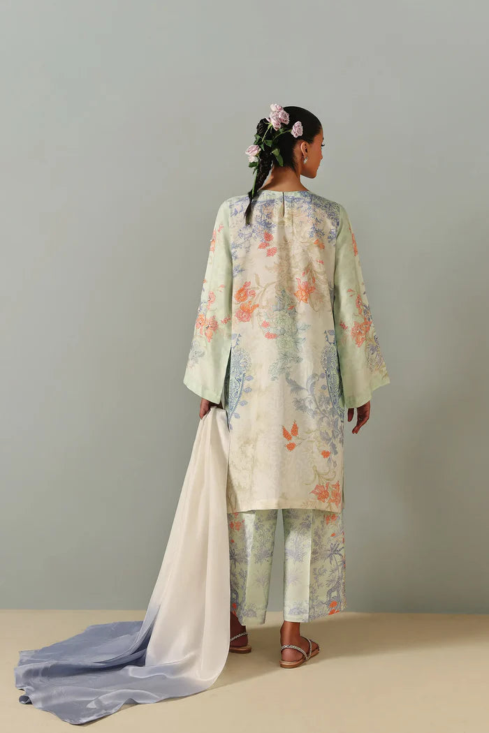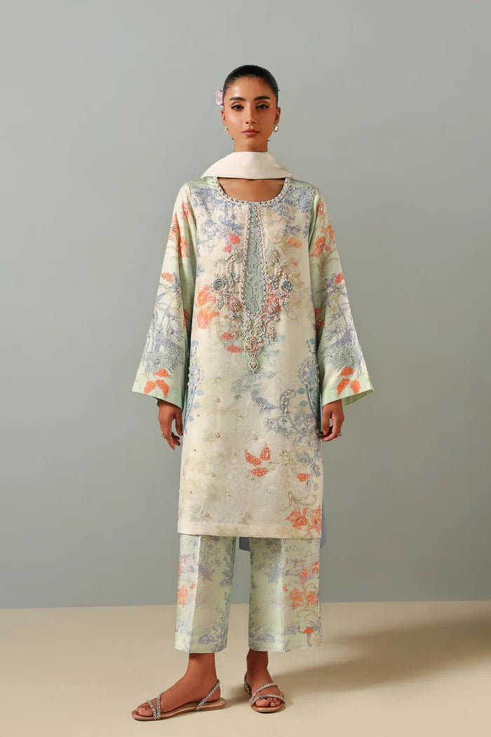 This ivory three-piece ensemble features a straight, relaxed-fit shirt with a floral and botanical print in pastel tones. The neckline is constructed with a lace applique and hand-embellished with pearls, sequins, and beads, with additional light embellishments distributed across the front. The set includes matching printed straight pants and a lightweight two-toned dupatta, that adds a soft, graceful contrast.