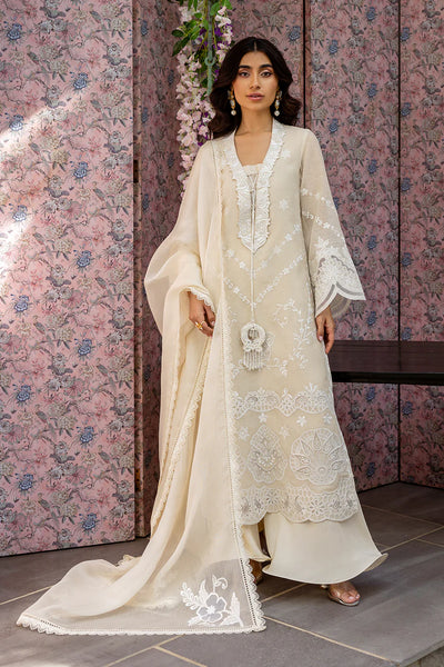 This Ivory masterpiece is crafted from pure Khaddi net, featuring a stunning 3D neckline and intricate embroidery adorning the shirt and sleeves. Delicate scalloped details on the sleeves and hem add a touch of charm, while playful tassels at the neckline offer a fun contrast. Paired with flared Khaddi silk pants, this outfit balances comfort and elegance effortlessly. The matching ivory Khaddi net dupatta, with appliquéd 3D flowers and delicate lacework, completes the look with a refined and luxurious finish.