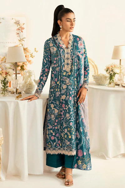 Elevate your summer style with this elegant 3-piece unstitched outfit. The lawn shirt features a digitally printed Chikankari embroidered front, complemented by a printed back and sleeves. An embroidered lace neckline and detailed borders on the front and sleeves add a refined, traditional touch. Paired with a beautifully printed lawn dupatta that enhances its vibrant appeal, the look is completed with a plain dyed cotton trouser for all-day comfort. This ensemble perfectly blends timeless embroidery with modern prints, making it ideal for casual and semi-formal occasions alike.