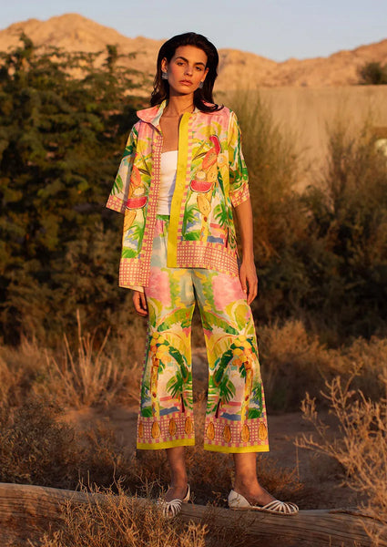 Lush palms and abstract washes of guava pink, lime, and sunshine yellow spill effortlessly onto the fluid culottes, where playful fruit borders along the hem add a final flourish of high-summer color.