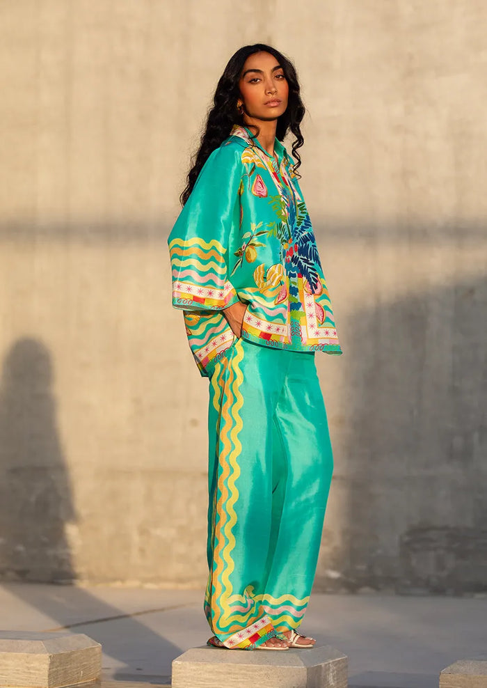 Cut from pure, weightless raw silk in a saturated turquoise hue, the Orla set channels high-summer ease with painterly precision. A lush medley of hand-rendered fruits, vines, and florals cascades down the front in expressive watercolor strokes in blush pink, lemon zest, lime, true blue, and verdant green tones.