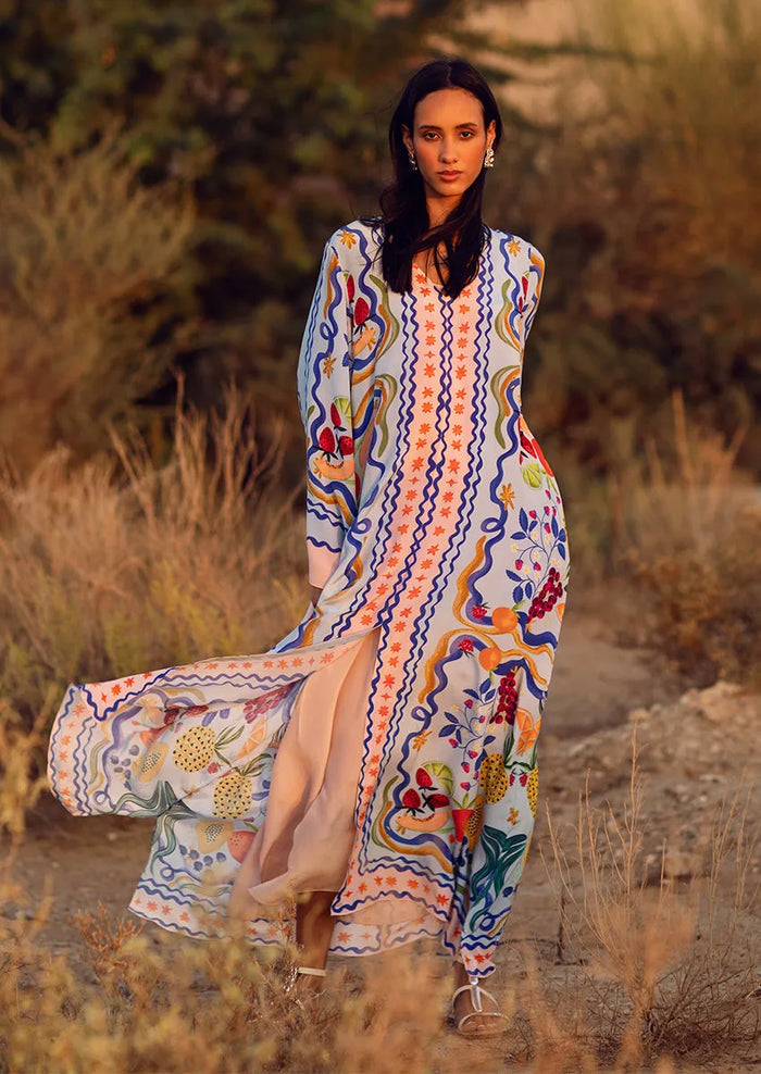 Bold and playful, the Paloma kaftan is a head-turner in luxe misty-blue crepe. Adorned with vivid fruit motifs, squiggly borders with whimsical starburst elements, and Mediterranean-inspired prints, it flows effortlessly with every step. A vibrant celebration of color and craftsmanship, the kaftan is elevated with dramatic flared sleeves.