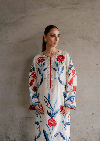 An ivory kaftaan brought to life with Iznik inspired artistry red and blue tones. The neckline is handcrafted with pearls, sequins and swaroskis. Tailored from pure 80-gm rawsilk, it offers a fluid drape and refined finish. Complimented by Korean raw silk pants, this ensemble is a heritage and timeless sophistication.