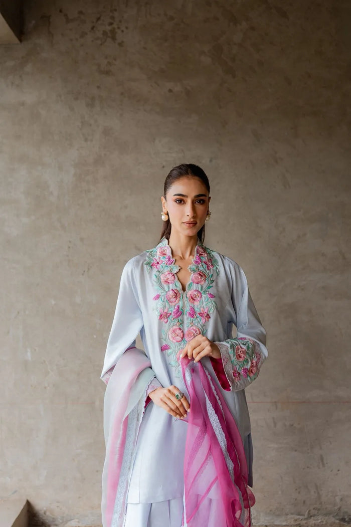 A pure raw silk, elegant Farshi shalwar set, adorned with intricate thread embroidery and exquisite hand embellishments of cut dana and sequins. The three-toned dupatta is beautifully finished with delicate lace detailing, making this ensemble a perfect choice for a fancy iftar party or an Eid lunch