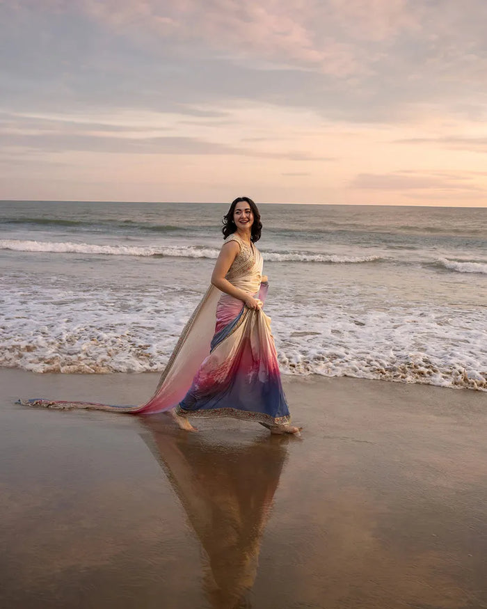 Reflecting old world elegance, Lena channels refined sophistication presented on a refreshing cream and ombré canvas. The embellished chiffon blouse, sheer net sleeves and silk sari are adorned with kutdana, badla and kora motifs that elevate the outfit to make you the centre of attention.