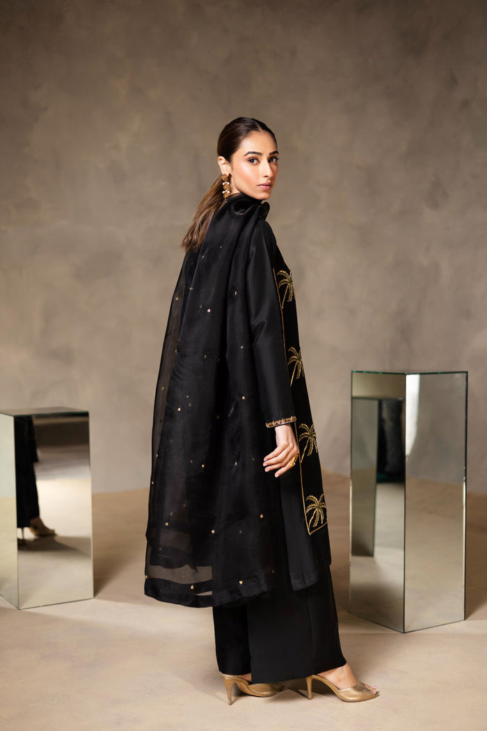 Anna—an indulgent masterpiece in midnight black, designed to exude elegance. This stunning ensemble features a pure rawsilk shirt and trousers, beautifully adorned with intricate Zari and thread embellishments that showcase exceptional craftsmanship. The flowing pure organza dupatta adds a soft, ethereal touch, perfectly complementing the bold, sophisticated look. Ideal for special occasions, Anna celebrates your charm in timeless style, ensuring you stand out with grace and poise. Its luxurious textures and fine detailing make it a true statement piece for any elegant event.