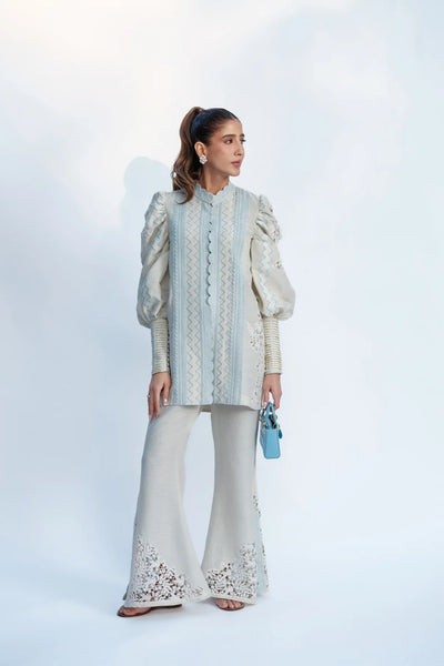 This exquisite ensemble is a true testament to intricate craftsmanship and refined design. Featuring a structured silhouette, it is adorned with delicate lacework and thoughtfully placed crochet patching that adds rich texture and dimension. Symmetrical zigzag embroidery runs along the front, offering a bold visual contrast that draws the eye. The voluminous sleeves, detailed with soft pleating, taper into finely ruched cuffs—adding a sophisticated finish to the overall look. Designed to be both timeless and distinctive, this ensemble strikes the perfect balance between structure and softness.