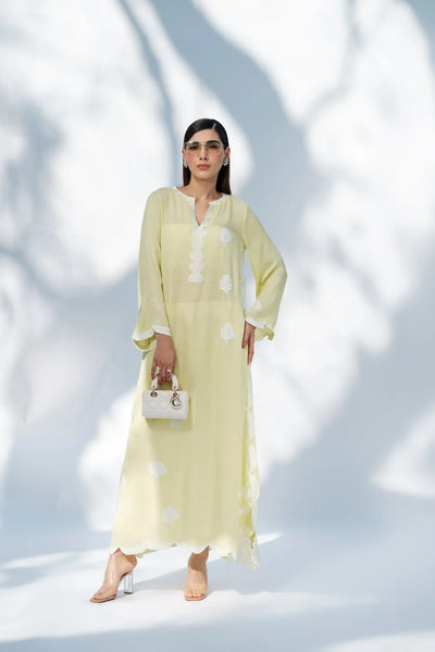 This Kaftan is designed with a relaxed, flowing silhouette and features intricate white appliqué embroidery that delicately traces botanical motifs across the fabric. The scalloped neckline and sleeves add a touch of femininity, while the sheer, lightweight weave ensures both breathability and comfort. The garment is finished with organically cascading floral embroidery along the hem, enhancing its natural elegance. Fully lined for a smooth and comfortable fit, this Kaftan is perfect for sophisticated, laid-back occasions.