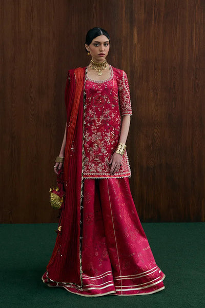 Crimson pink subtle printed velvet sharara with lappa details at the hem.