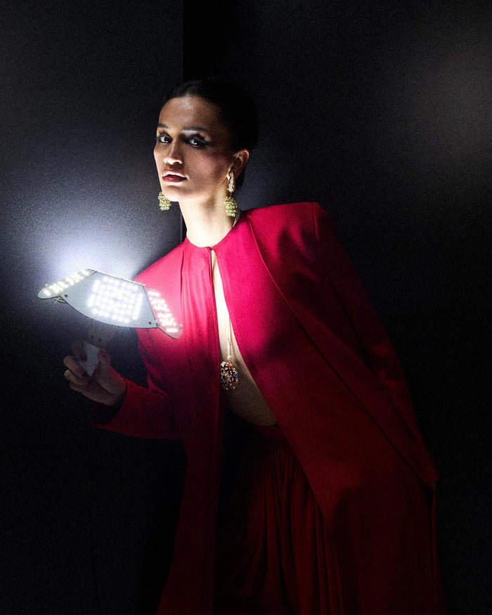 A long tailored coat layered over fluid harem pants. Paired with a softly draped shirt tied with a single knot and left open. The look is finished with gold metallic coin and fabric tassels.