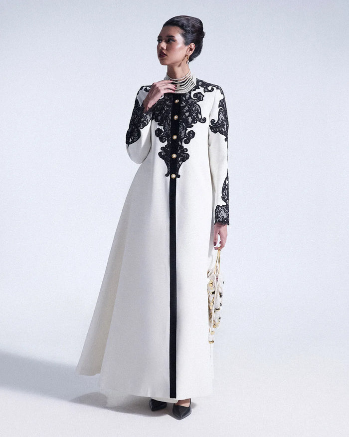 Crafted in ivory grip, this long structured jacket features a refined crew neckline, elevated with handcrafted black Chantilly work along the neckline and sleeves. Customized pearl buttons add a touch of understated elegance. (Bag is a separate accessory)