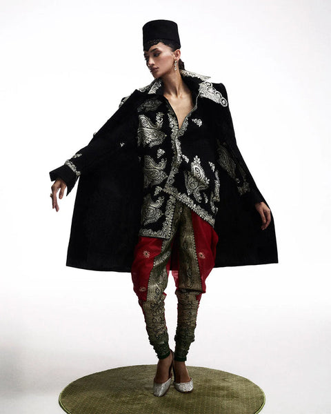 A luxurious long velvet coat featuring intricate silver buttons that add a touch of sophistication. The look is elevated with a handcrafted collar embellished with mirror, metal, and beadwork, blending artisanal detail with elegant design for a striking, refined finish.