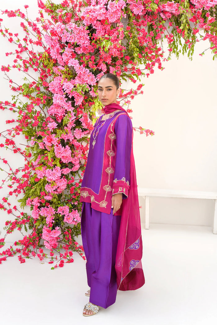 Rosy Plum is a two-toned ensemble blending scarlet purple and vibrant cranberry pink. Crafted from pure sheesha silk, it features a short shirt paired with a seasonal farshi shalwar. The shirt is richly adorned with Japanese katdana work and Swarovski crystals, adding a touch of elegance. A pure sheesha organza dupatta completes the luxurious look.