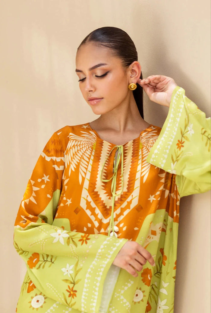A flowing crepe kaftan, color blocked in rich terracota and pistachio, offers the perfect canvas for intricate folkloric inspired motifs. The print blends geometric and floral patterns in shades of ivory, burnt orange, ochre, and olive, arranged symmetrically to create a flattering elongating effect. A tasseled slit at the neckline is framed by a geometric border and a delicately mirrored palm motif, striking a balance between artistry and effortless sophistication.