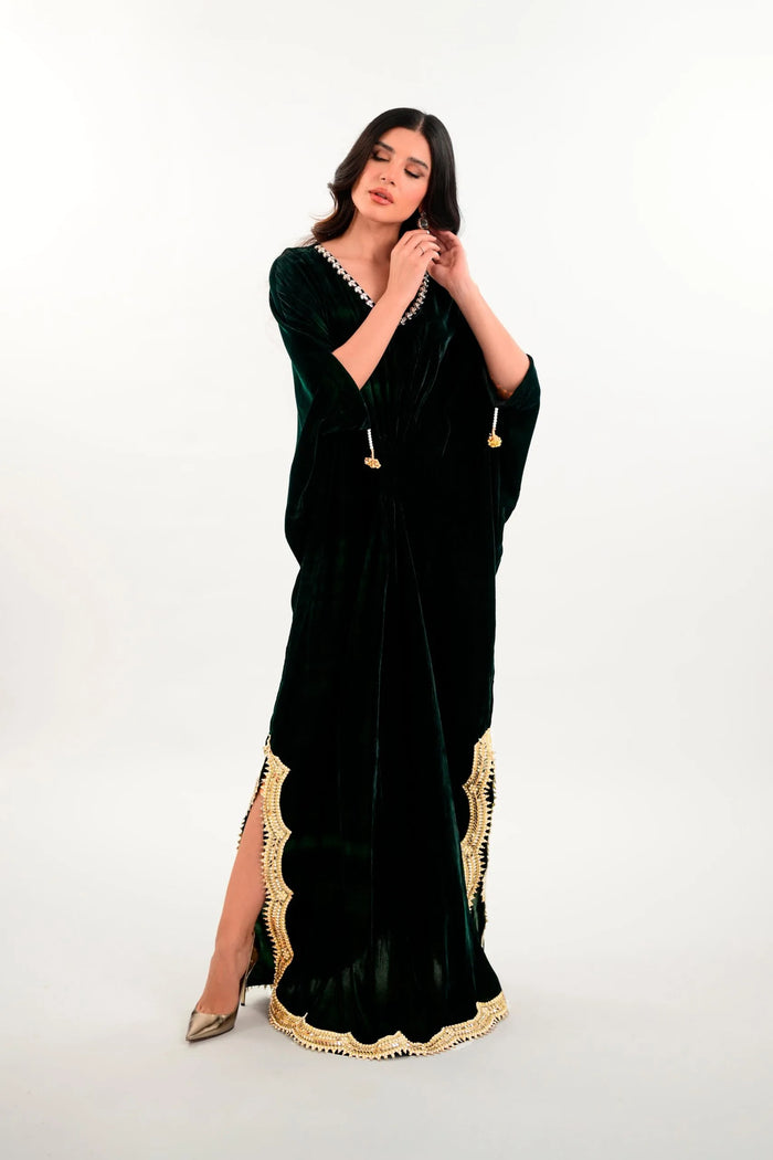 Elevate your elegance with our stunning green velvet kaftan, adorned with delicate kundan string on the neckline and intricate golden accents on the slits. This luxurious ensemble exudes sophistication and refinement, perfect for special occasions.