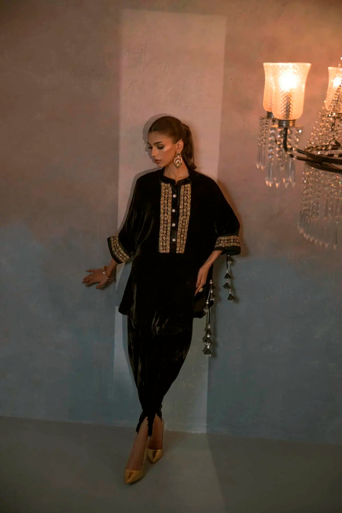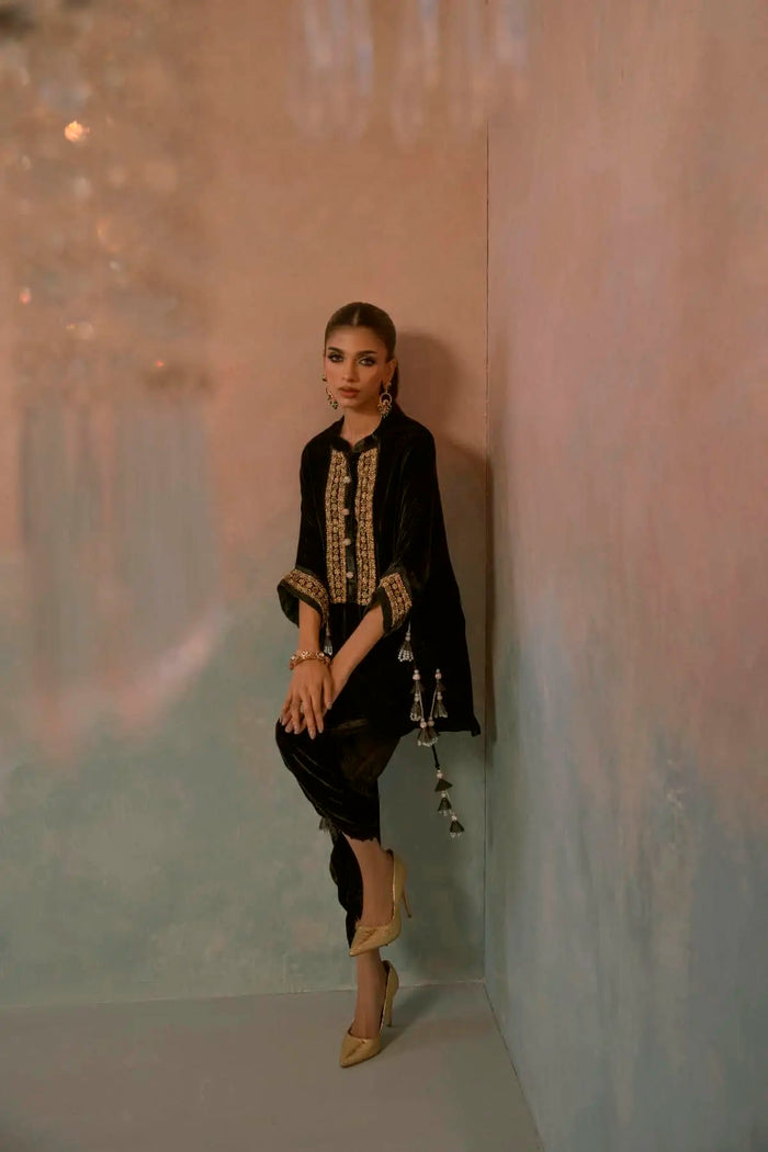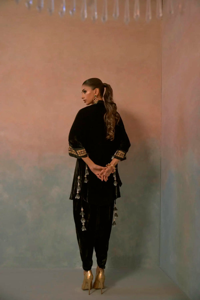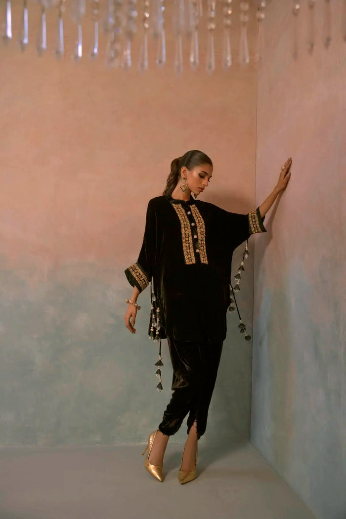 A chic black short shirt beautifully adorned with gold dabka and zardozi hand embroidery on the neckline and sleeves. Detailed with gorgeous tassels on the side slits.