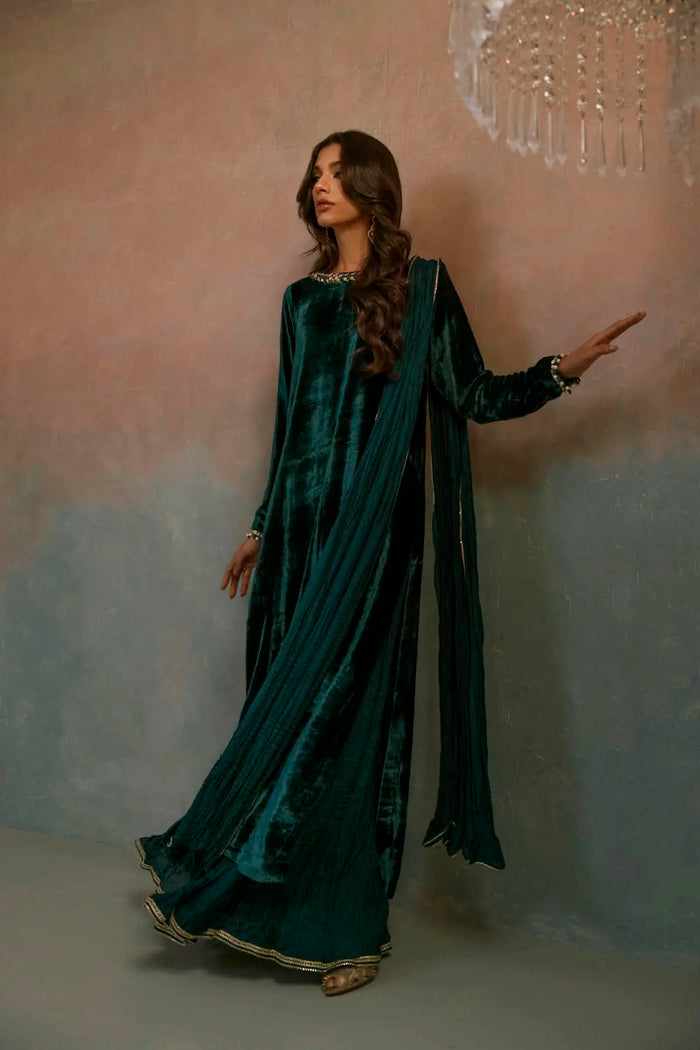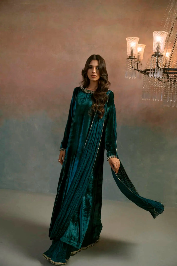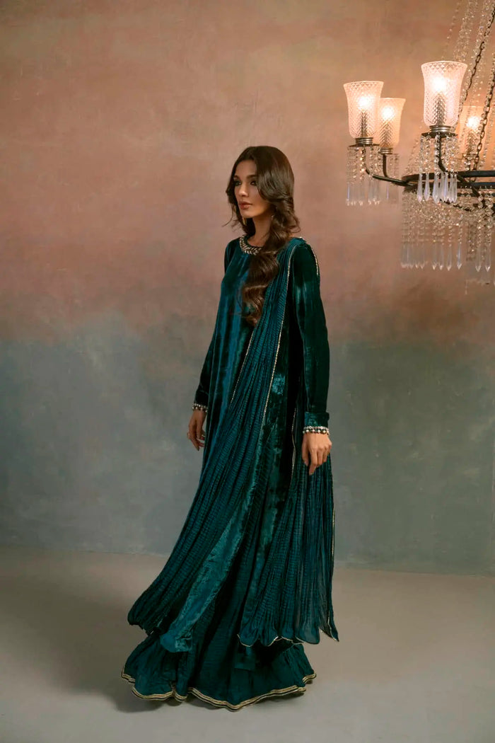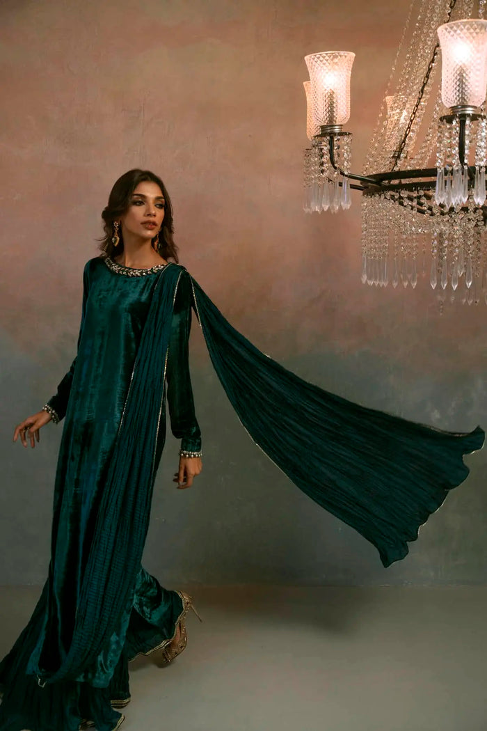 A contemporary take on a sleek velvet shirt adorned with handcrafted work on neckline and sleeves. Attached crushed silk draped dupatta for an effortless elevated look and paired with crushed gharara pants.