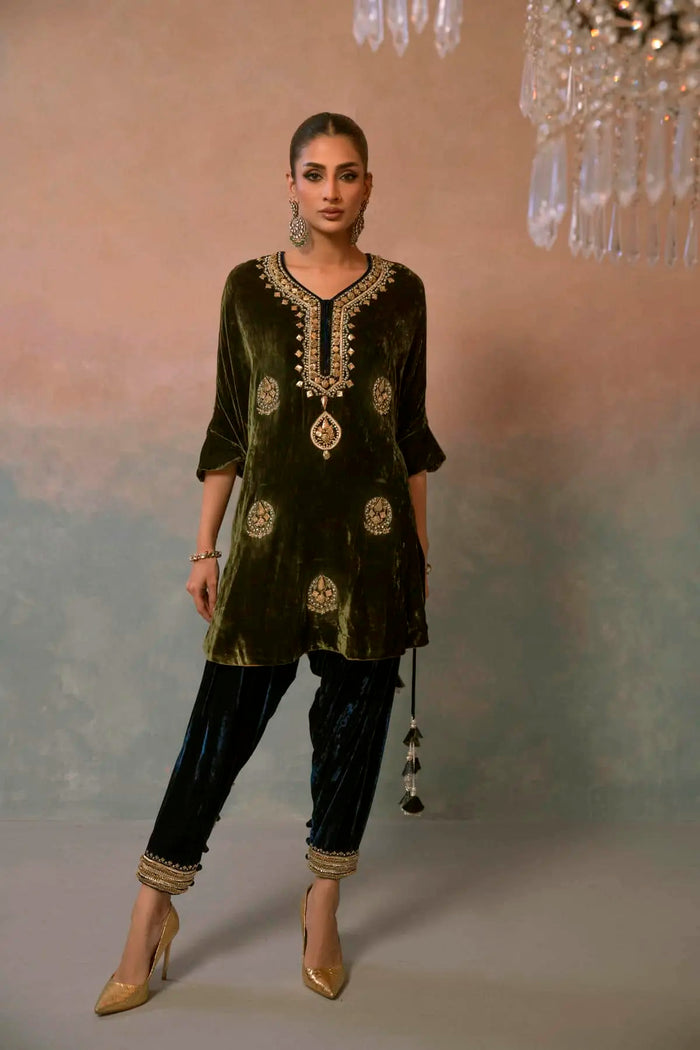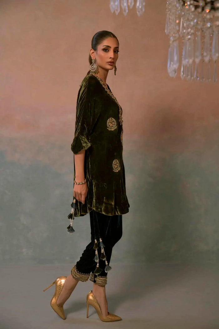 An olive velvet shirt adorned with intricate gota detailing, paired with a contrasting blue tulip shalwar beautifully enhanced with dabka and gota work. Detailed tassels with embellished organza cones. The rich textures and vibrant hues make this ensemble a perfect pick for festive celebrations with a playful yet elegant flair.