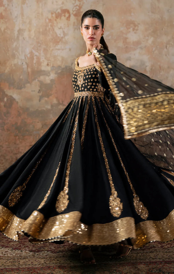 This black pishwas with gold accents is a stunning blend of boldness and sophistication. This silk pishwas with heavy borders and hand embellished bodice paired with heavily hand embellished sleeves using dabka nakshi and kora. A silhouette that blends traditional Mughal grandeur with modern craftsmanship. Paired with an ordanza dupatta, celestial-inspired piece that blends delicate craftsmanship with whimsical charm. It's perfect for mehndi, sangeet, receptions, or even as part of a bridal look for someone seeking an ethereal, romantic aesthetic.