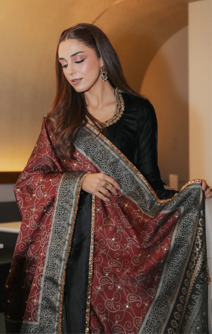 Exuding charm, NAME showcases unparalleled glamour. Crafted on black velvet, the kalidar shirt features intricate patterns of dabka, tilla and dazzling sequins delicately adorning the neckline. Paired with a lavishly chunri inspired silk sequins dupatta, this set also includes gota and sequin worked velvet Chaddar, elevating the ensemble to the perfect festive piece