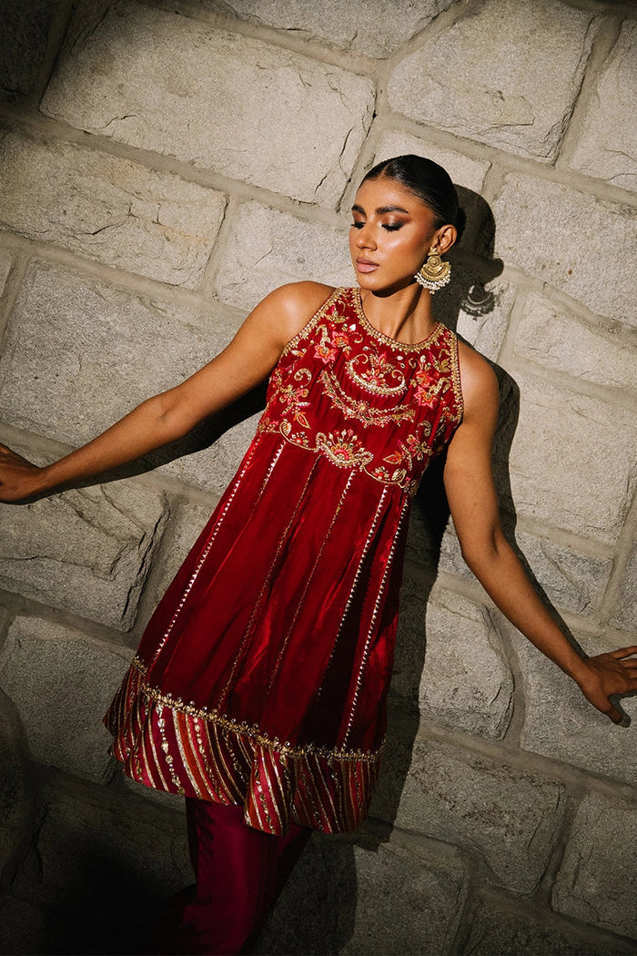 Adorned with gotta work on the yoke and chatta patti along the ghair, this short velvet peplum is cut from a stunning deep red hue! Pair this peplum with a contrasting magenta boot cut pants for a head turning look this winter festive season!