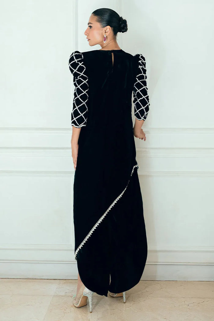Rhea black velvet shirt and pants set showcases handmade diamante and pearl embellishments on the neckline and sleeves, paired with diamante borders on the damaan and sides. Styled with butterfly pants featuring a 3D butterfly accent.