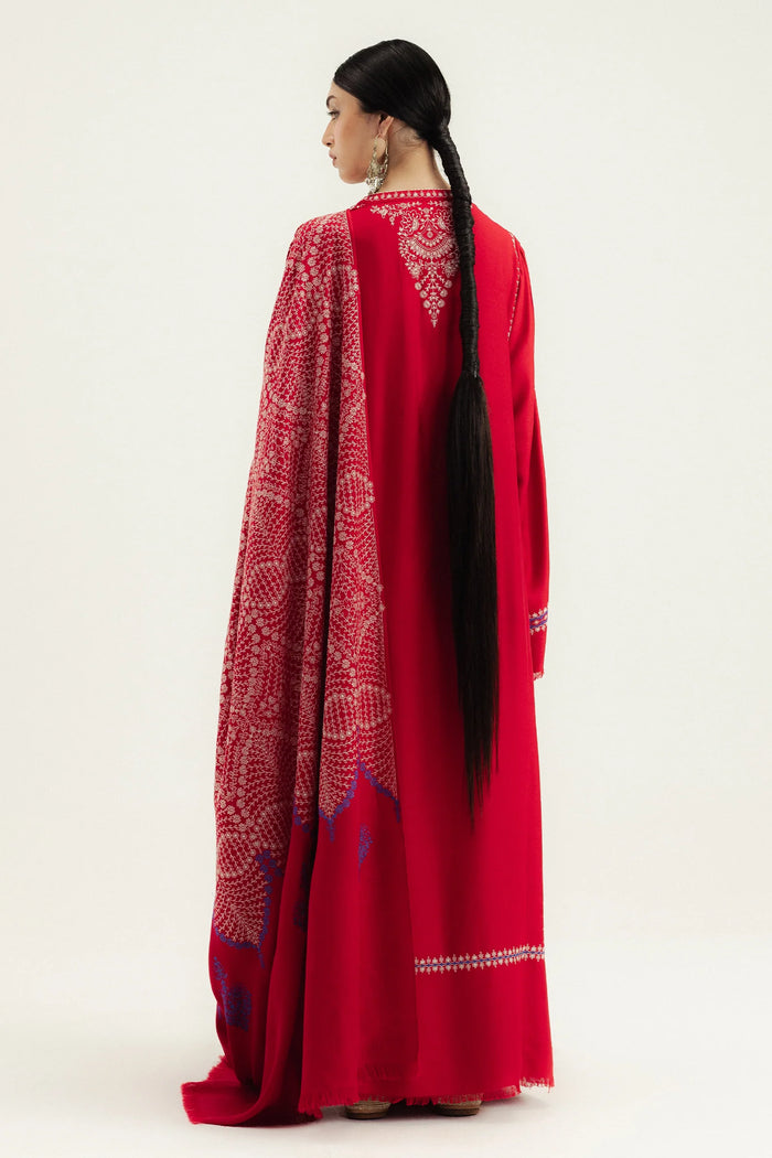 A signature red five-paneled kurta adorned with intricate Kashmiri embroidery on the front and back, showcasing fine craftsmanship and detail. Paired with a heavily embroidered red marina shawl featuring a pop of cobalt blue and matching tonal trousers, this ensemble reflects warmth, heritage, and timeless elegance.