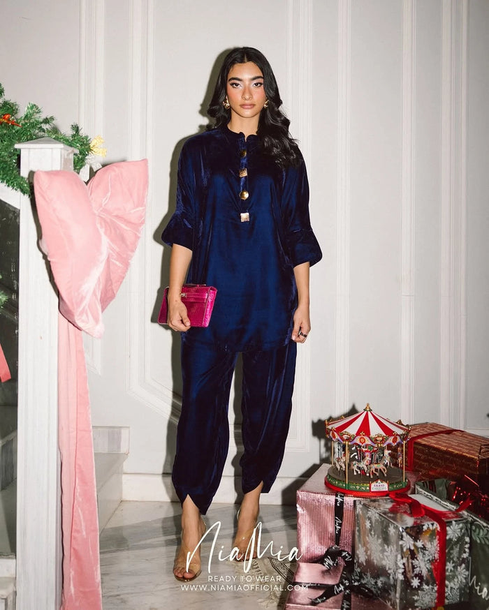 A rich midnight-blue velvet set designed with statement gold buttons and a relaxed silhouette. Paired with our signature NiaMia cut shalwar, Aurora brings a bold yet refined charm to winter evenings.