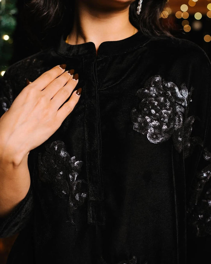A rich black velvet two-piece adorned with tonal sequined floral motifs. The relaxed, easy silhouette pairs with a matching velvet shalwar, creating a refined yet effortless festive look.