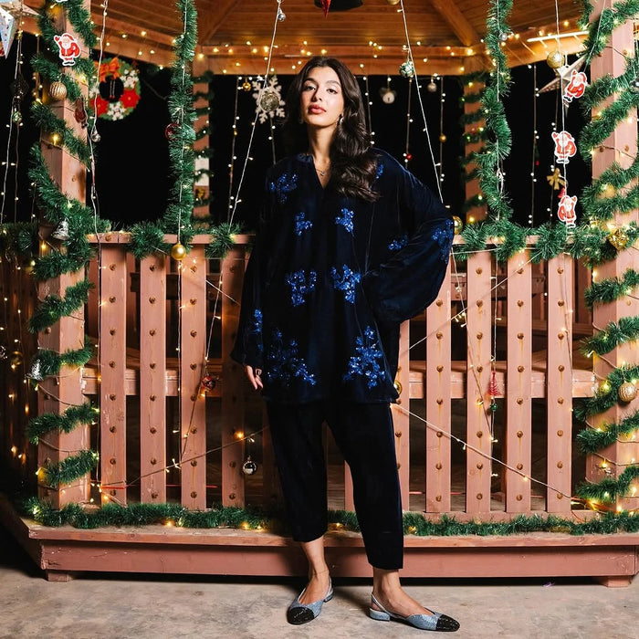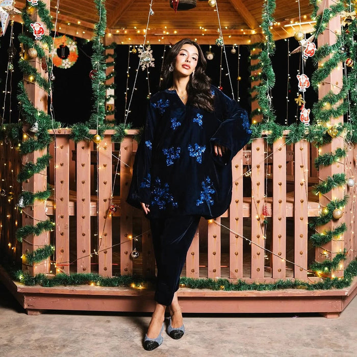 A deep midnight-blue velvet set embellished with shimmering blue sequined florals. Paired with a soft velvet shalwar, Glacier offers a luminous, winter-ready elegance perfect for evening wear.