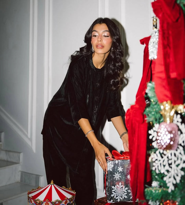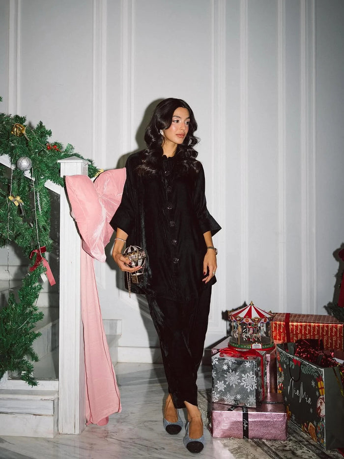A classic black velvet two-piece featuring a sleek button-down shirt paired with a soft, draped shalwar. The subtle sheen of the velvet adds effortless elegance, making it a timeless festive essential.